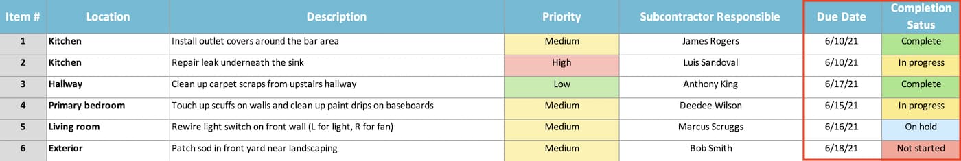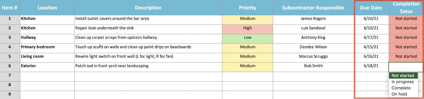 Finally, enter a deadline for each task on your checklist in the Due Date column, and set the Completion Status for new punch list items to Not started.