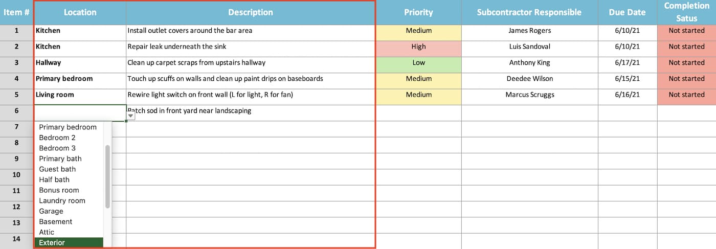 Indicate the punch list task priority by choosing an option from the dropdown in the Priority column. The template should automatically apply a priority color to the cell once you’ve selected an option. Then choose the type of work or subcontractor name from the Subcontractor Responsible dropdown to assign the punch list item to an owner.