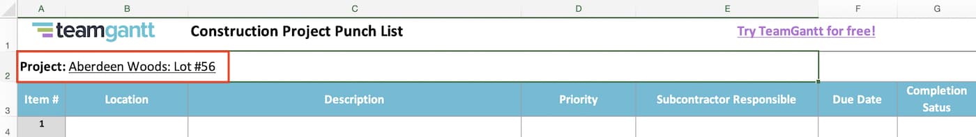 Start by adding any relevant details to identify the project’s punch list for subcontractors. You can enter this project information in row 2 on our construction punch list template.
