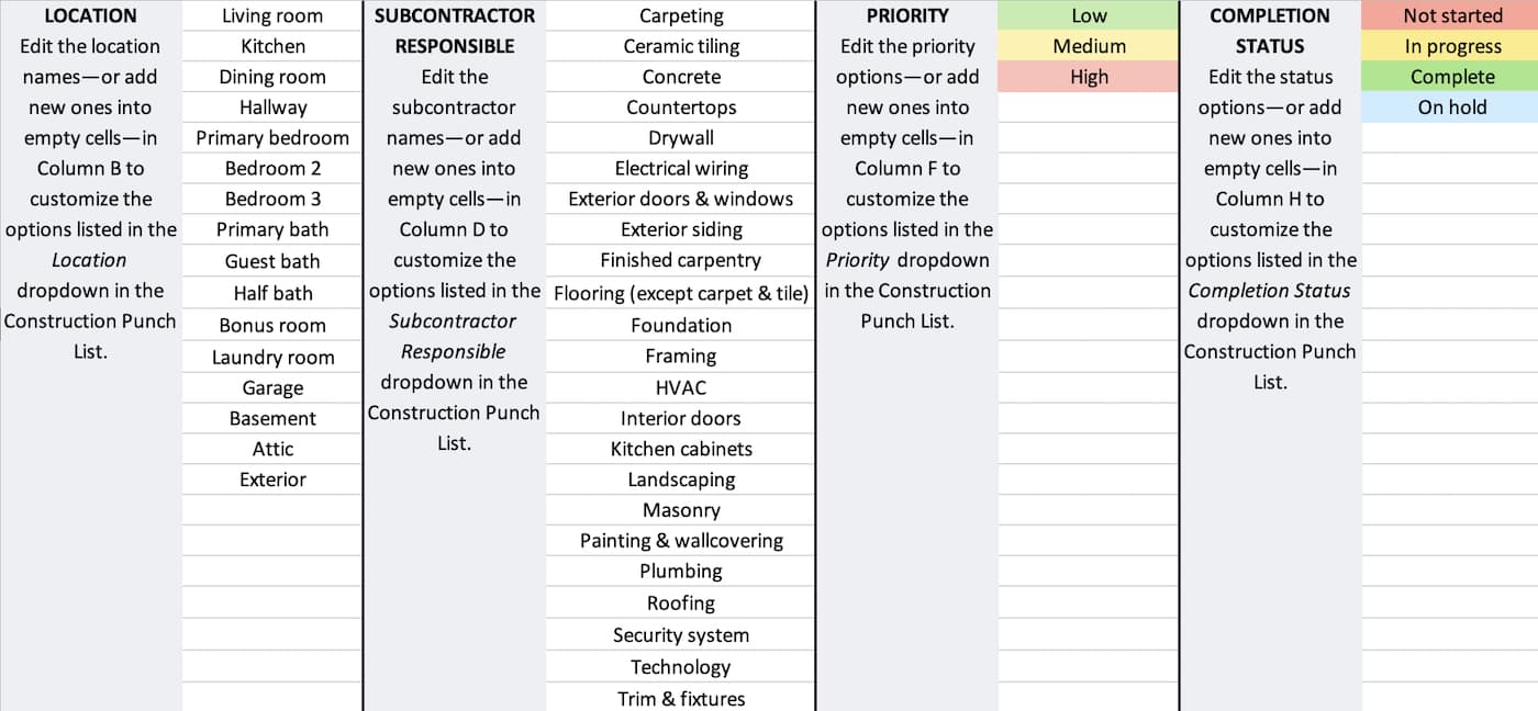 - Completion Status: These options are also fairly standard and have conditional formatting applied to color-code each option when you select it on the Construction Punch List tab. If you edit the Completion Status labels, be sure to update the conditional formatting rules too.