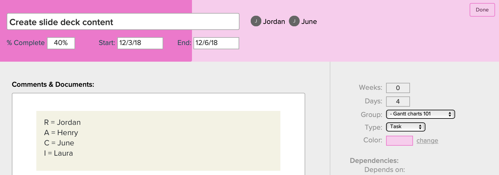 Use a RACI chart to document roles and responsibilities, and add this info to task notes in TeamGantt so it’s easy for your team and stakeholders to find at the task level.