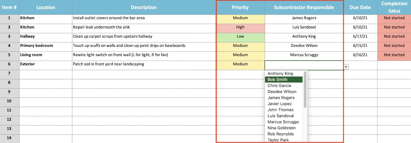 Indicate the punch list task priority by choosing an option from the dropdown in the Priority column. The template should automatically apply a priority color to the cell once you’ve selected an option. Then choose the type of work or subcontractor name from the Subcontractor Responsible dropdown to assign the punch list item to an owner.
